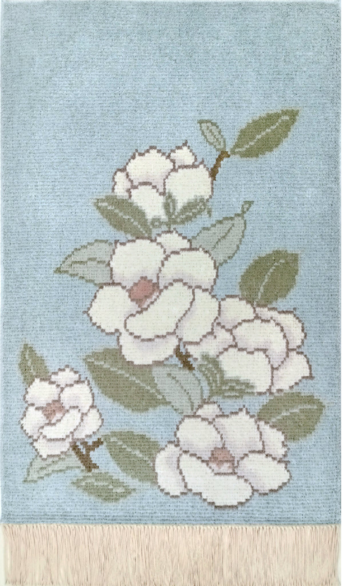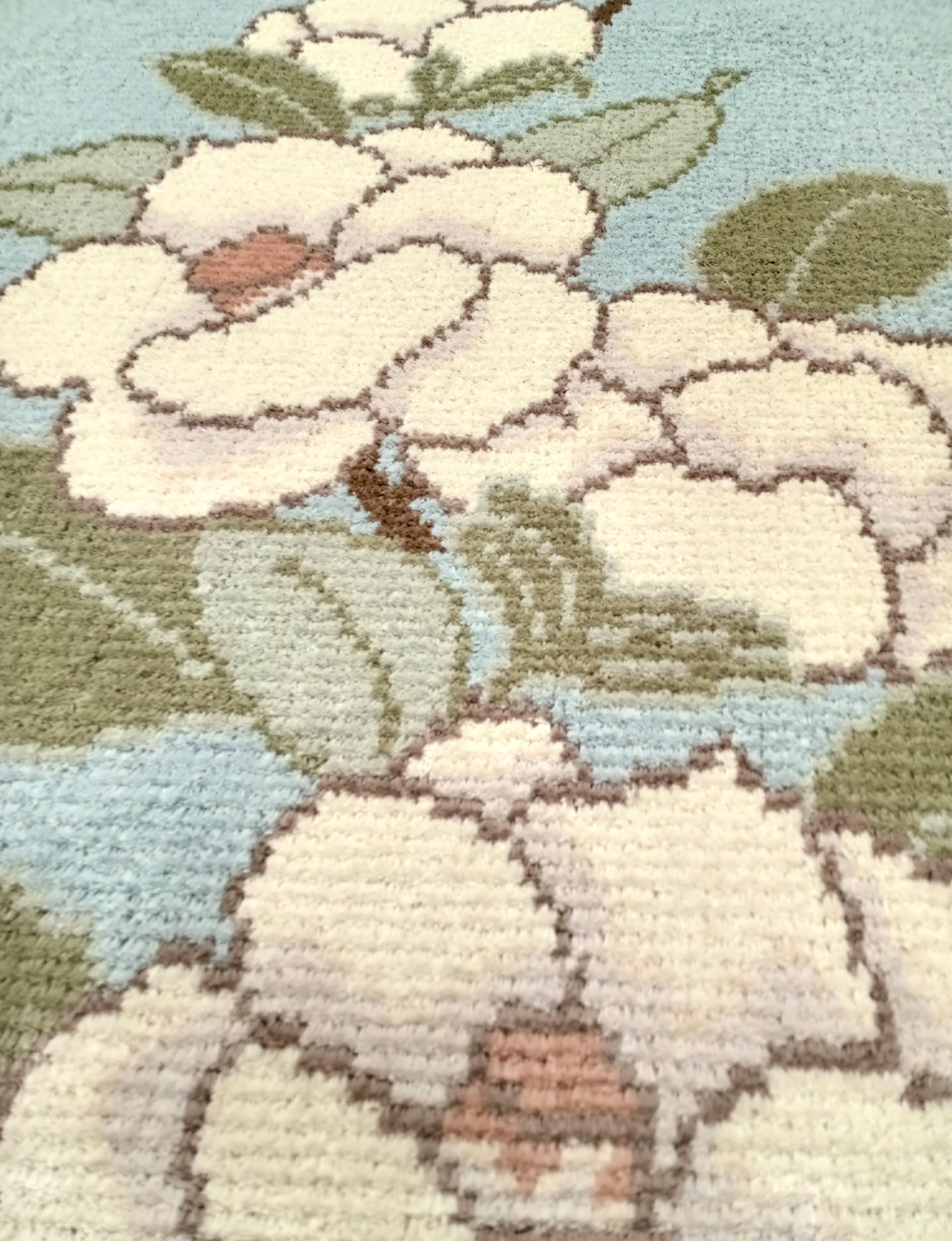 陶芸家 重要無形文化財指定(人間国宝) 井上 萬二氏から頂いたデザイン画を緞通にしました。青磁の色を本家ならではの色使いで鍋島緞通として表現した作品です。