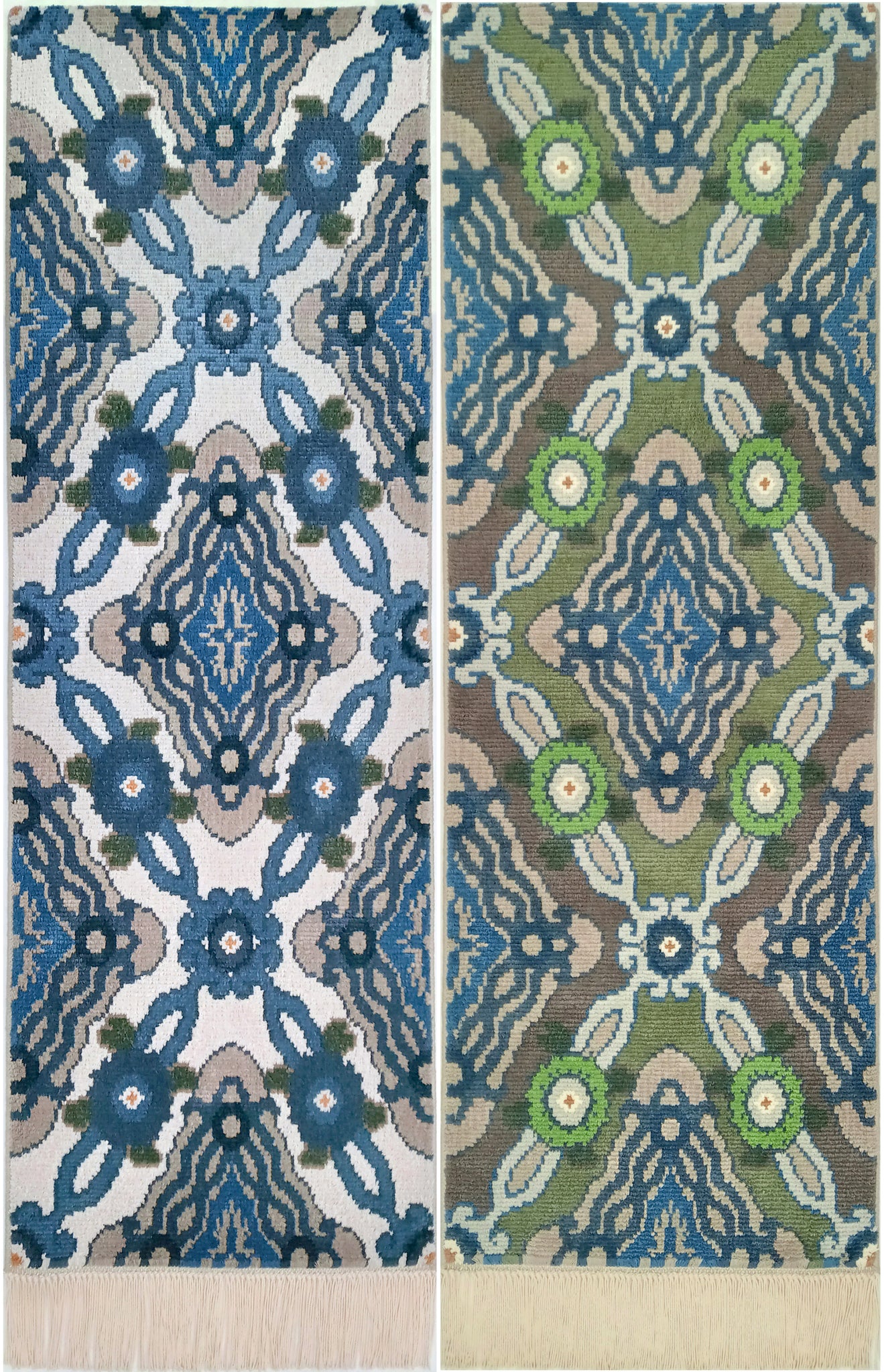 色鍋島の更紗文様をモチーフにデザイン。左側の明るい色調の「星花」と右側の緑の落ち着いた印象の「雪待」で同じ図柄で異なる色合いを表現した作品です。